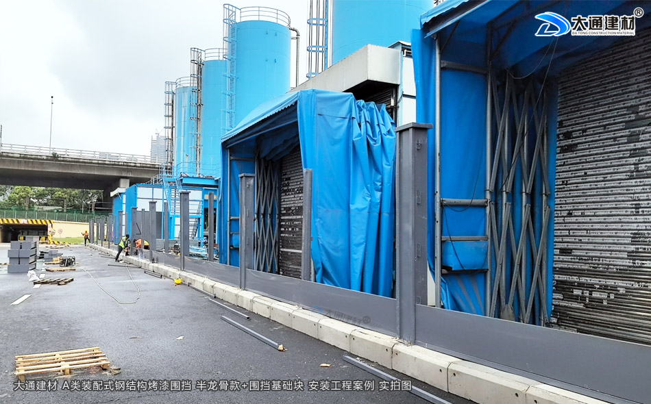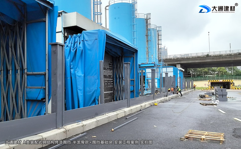 部分已安裝好的施工用的圍擋基礎塊、2.5米高裝配式烤漆鋼圍擋A款