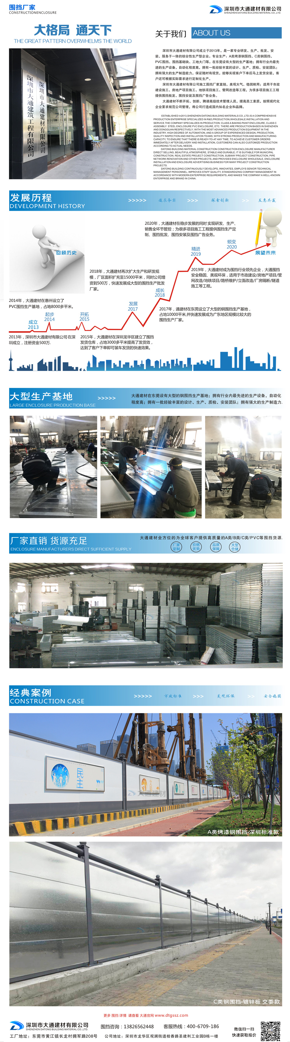 深圳市大通建材有限公司專業生產:A類烤漆鋼圍擋深圳標準款/半龍骨款、C類鋼圍擋烤漆款/鍍鋅板款、PVC圍擋、圍擋基礎、工地大門等。在東莞設有大型的生產基地;擁有行業內最先進的生產設備,自動化程度高,擁有一批經驗豐富的設計、生產、質檢、安裝團隊;擁有強大的生產制造能力,保證隨時有現貨,能夠實現客戶下單后馬上發貨安裝,客戶還可根據實際需求進行定制化生產。
