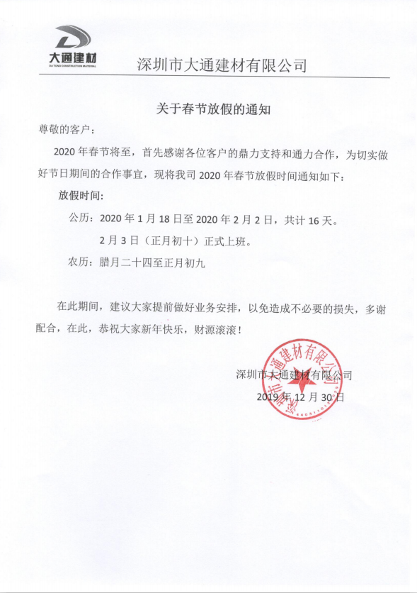 - 深圳市大通建材有限公司“2024年春節”放假通知2024-01-20