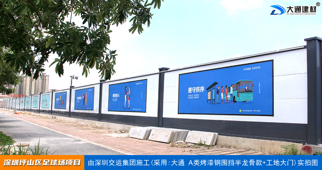 建設工程施工工地四周應按規定設置連續、密閉的鋼結構施工圍擋,建造多層、高層建筑的還應設置安全防護設施。在市區主要路段和市容景觀道路及市場、機場、碼頭、車站廣場等人流量、車流量比較多的地方設置的施工圍擋的高度不得低于2.5m,在其它路段設置的圍擋的高度不得低于1.8m。而深圳市大通建材A類鋼圍擋烤漆半/無龍骨款的標準高度是2.5米、長度為6.3米一擋,而圍擋高度特殊需求的如3//4//5/6/米等高度的可以進行定制化生產。